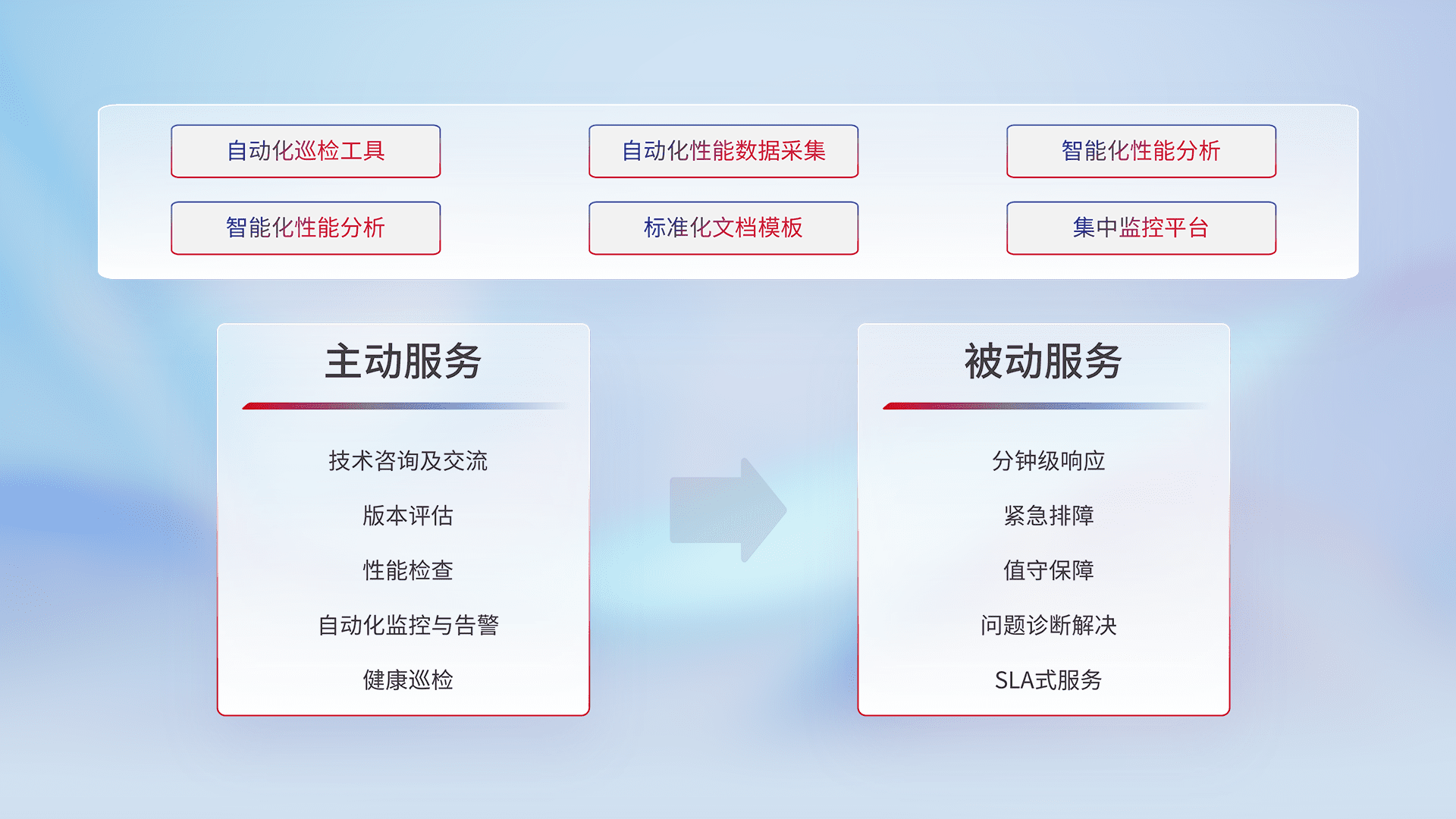 智能化工具和标准化文档,,,保障服务质量,,提供主动服务(包含技术咨询、、、、版本评估、、、、性能检查、、、、自动化监控与告警、、、、健康巡检)和被动服务包含(分钟级响应、、、紧急排障、、值守保障、、、问题诊断解决、、SLA服务)。。。。